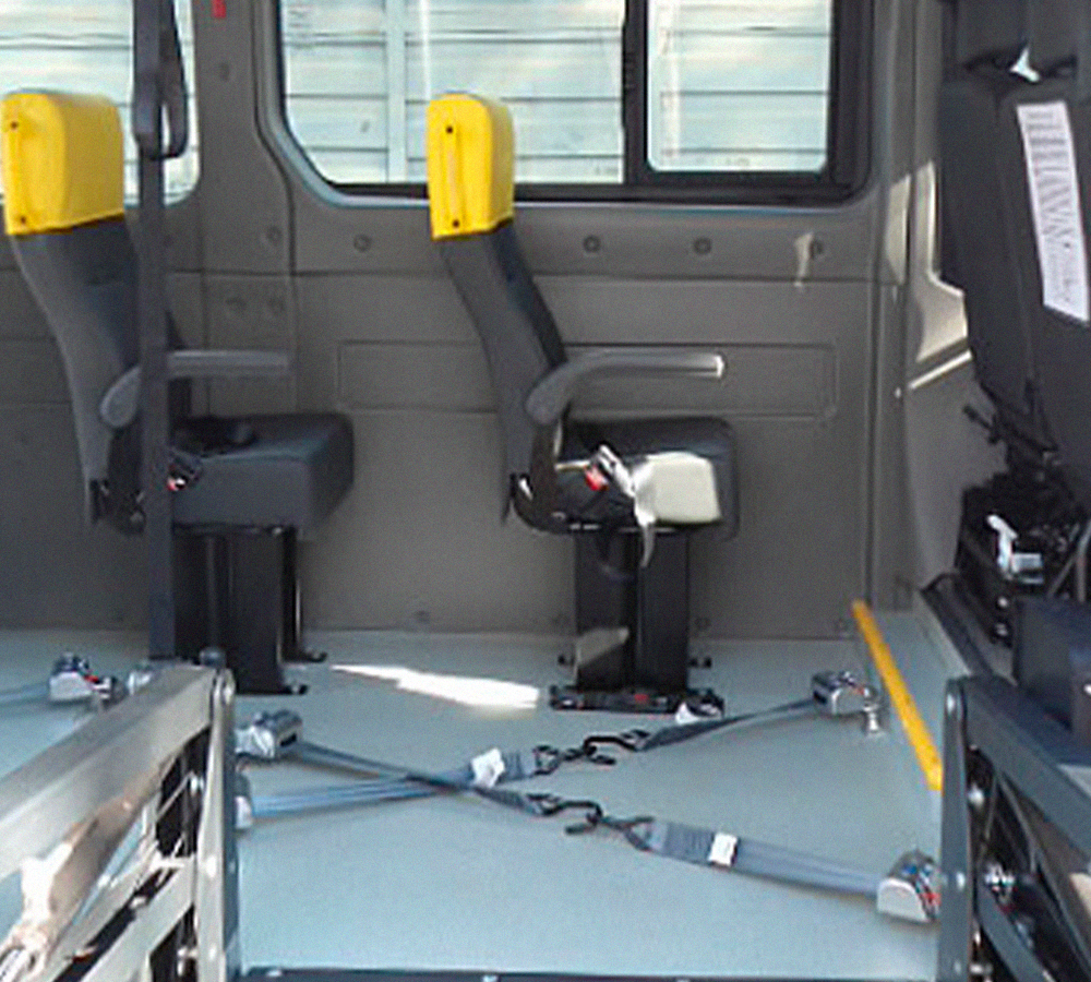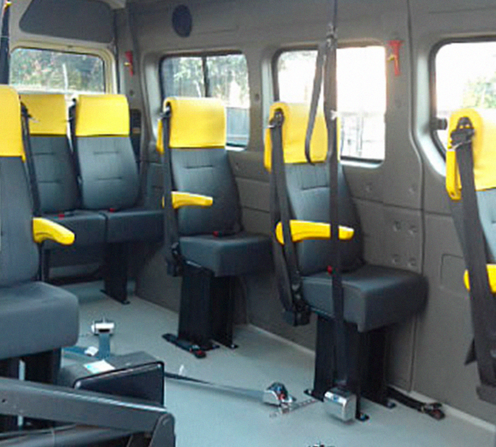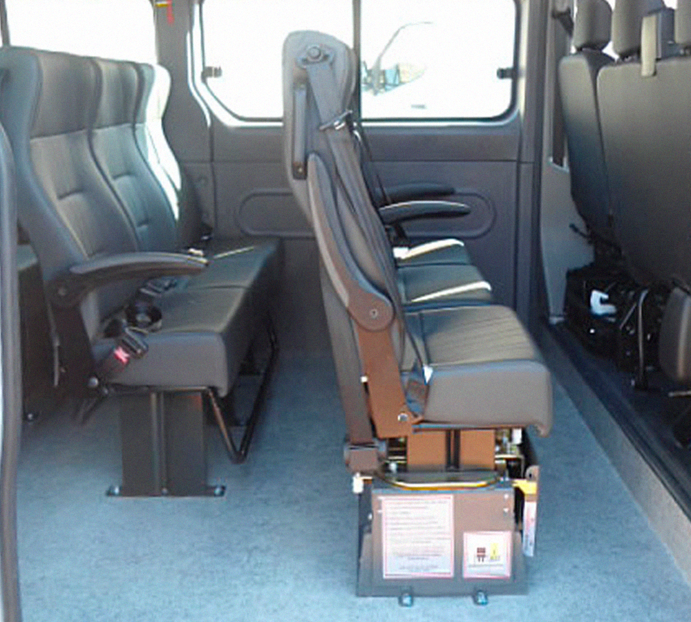 Montamos a configuração conforme a necessidade do cliente. Micro-ônibus com embarque por Dispositivo de Poltrona Móvel ou plataforma elevatória, e os devidos sistemas de fixação no salão de passageiros, garantem segurança e conforto ao usuário com necessidades especiais.